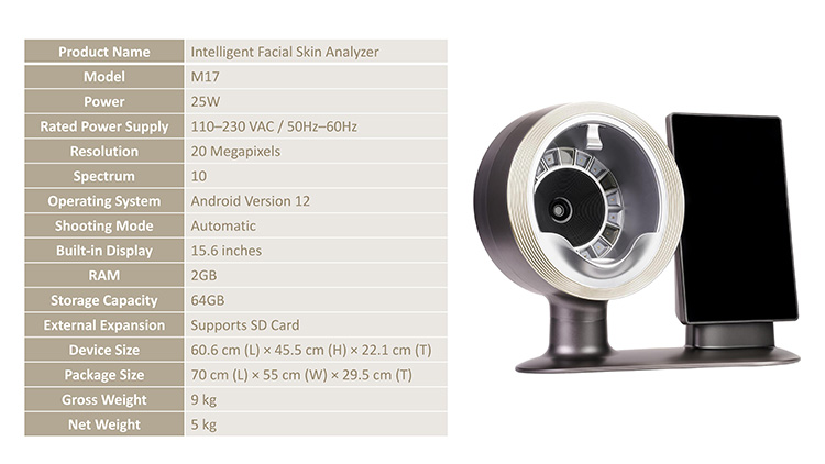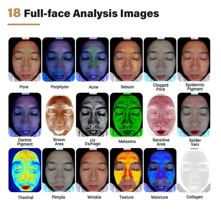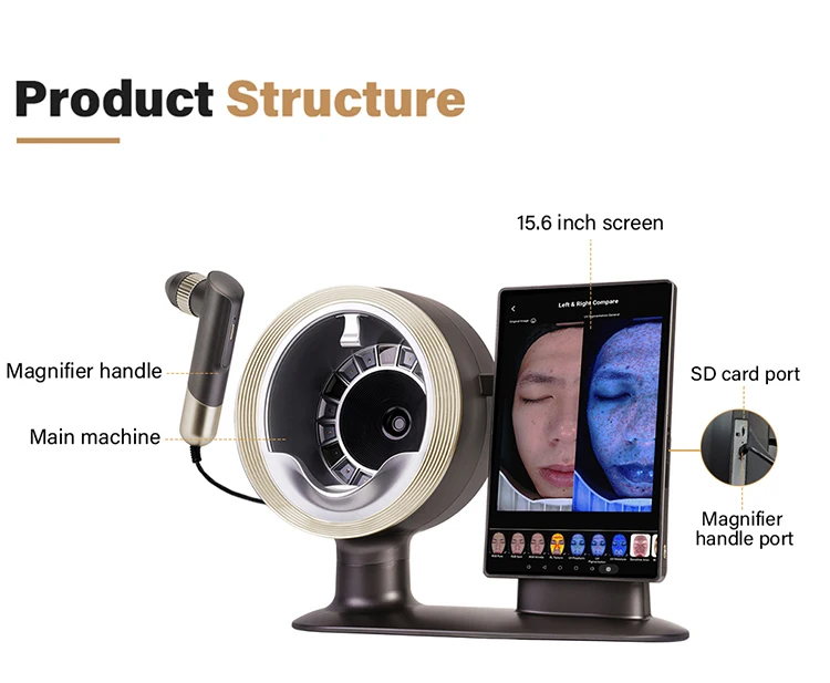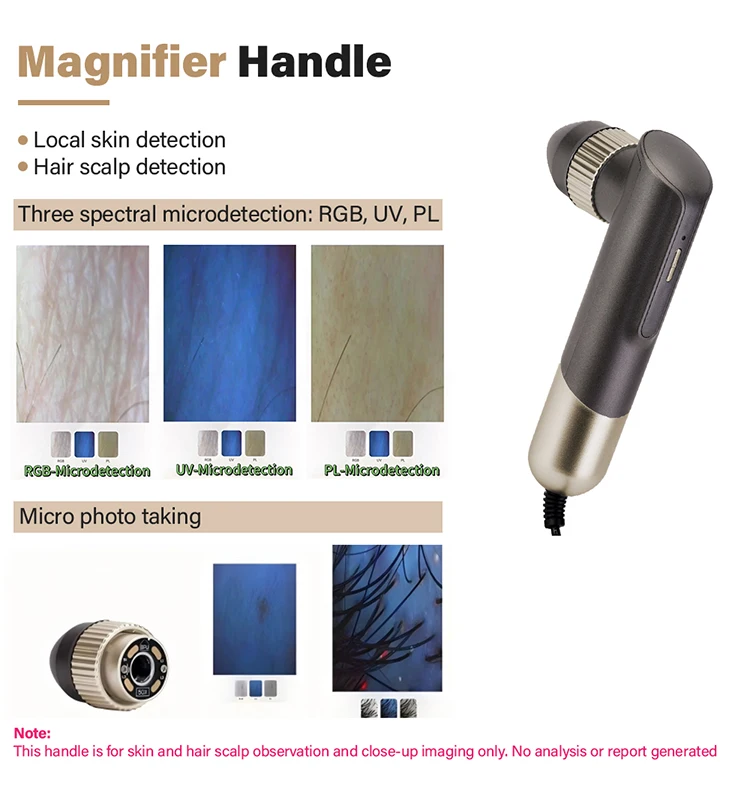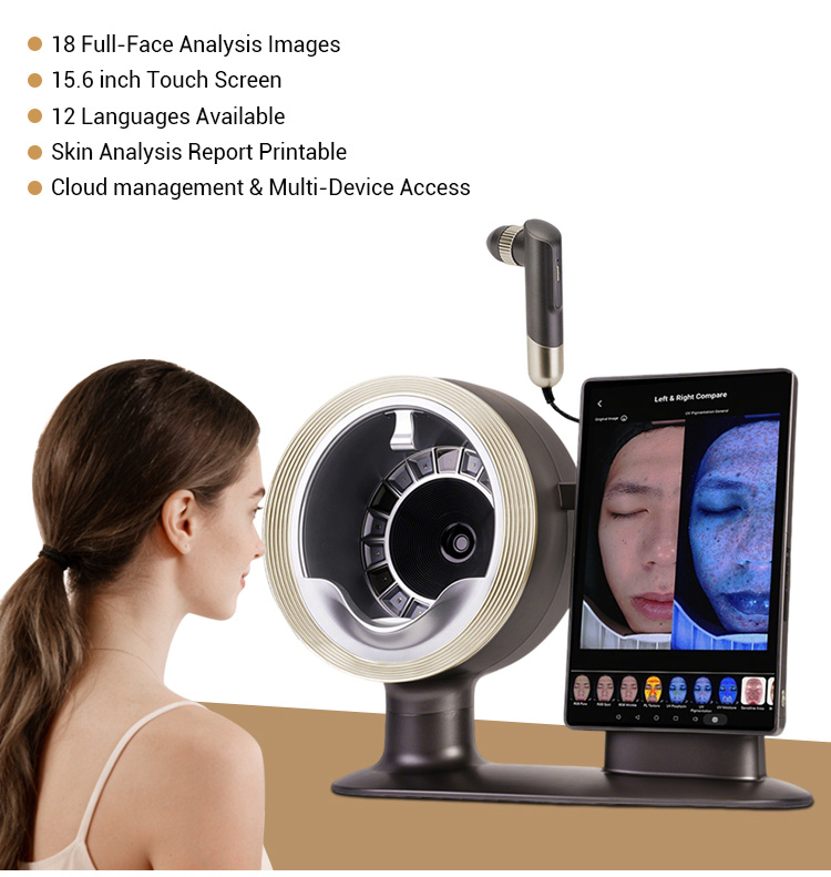 2-in-1 Skin and Scalp Analysis Machine, it can accurate analyze the skin conditions and scalp conditions, such as Pores, wrinkles, spots, Texture & hydration, Hair density & scalp health, all in 1 analysis and provide skin and scalp problem solution.