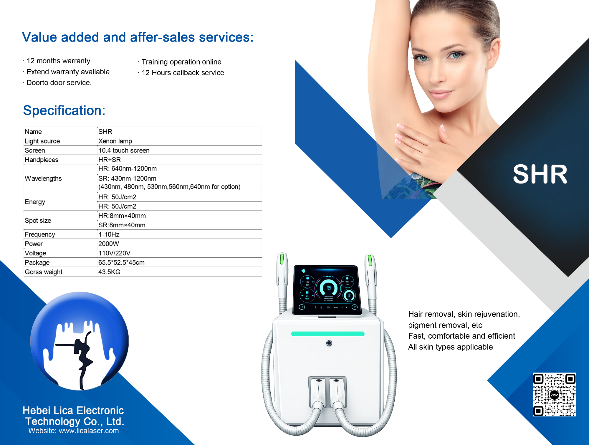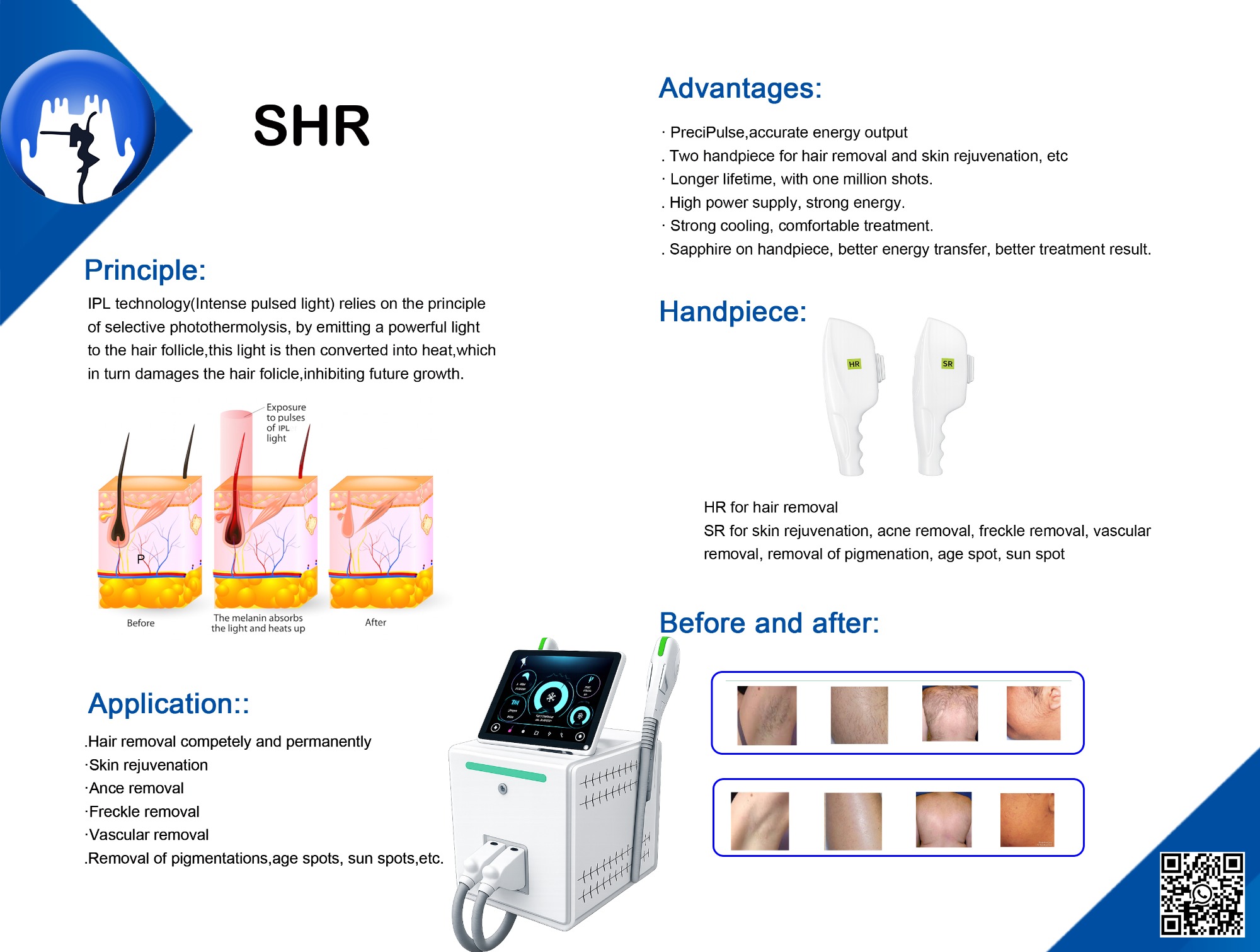 SHR is a new technology of permanent hair removal, with target pure wavelength , which works in a high repetition rate of short pulses ,by gradually heating the dermis to a temperature that effectively damages the hair follicles and prevents regrowth pain